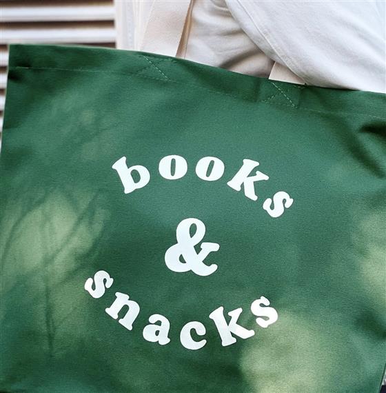 This hand illustrated 'Books & Snacks' design has been printed in off-white on sturdy forest green canvas.