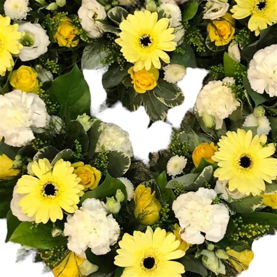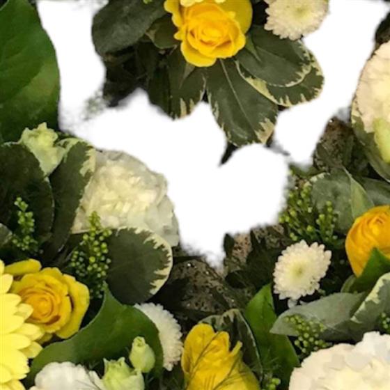 A selection of unusual greenery forms the base of this mixed open heart tribute, solidaster, nigella and asparagus fern create a delicate finish. Available as pictured or in your choice of colour