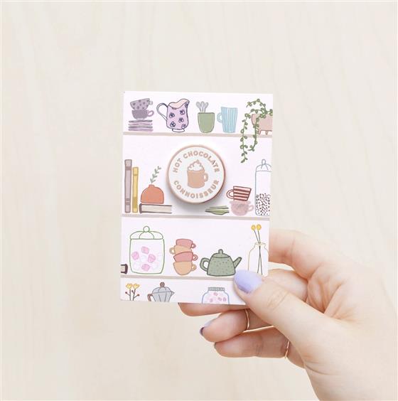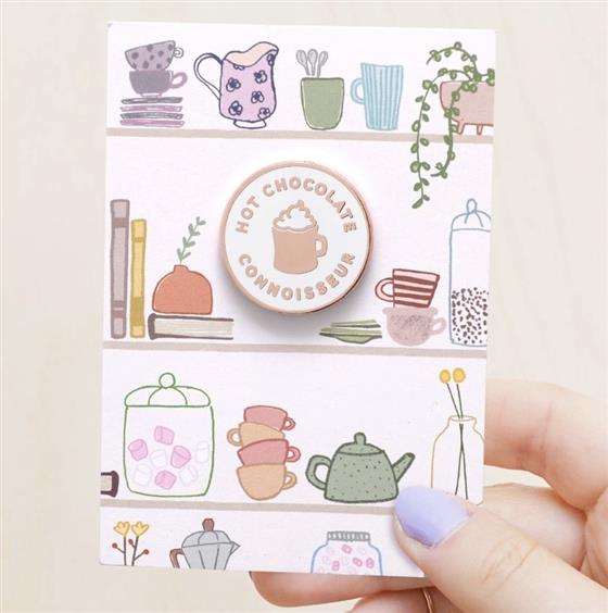 A lovely shiny little pin, featuring our 'Hot Chocolate Connoisseur' design. Made from white hard enamel and copper toned metal with a rubber clasp.