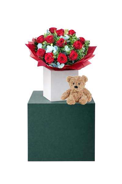 Each bouquet is hand-arranged using fresh red roses and soft foliage, carefully wrapped and styled alongside the teddy for a seamless, elevated presentation.