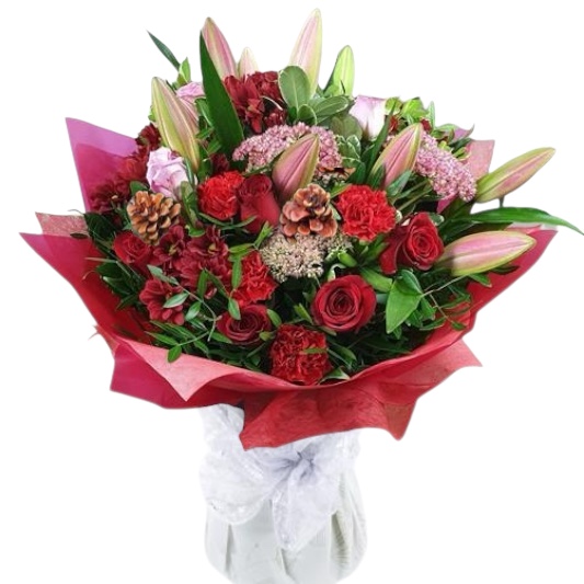 Bring a touch of festive romance to your home with The Noël Grandeur, a show-stopping Christmas bouquet that blends opulence, warmth, and modern elegance. Featuring velvety red roses, soft pink lilies, and seasonal greenery, this bouquet is designed to make a statement. Accented with winter berries, spruce, and pinecones, it’s the ultimate centrepiece for the season of celebration.