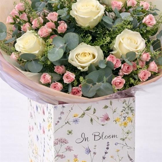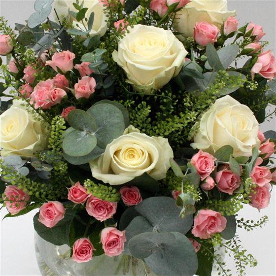 Creamy ivory roses and delicate blush sprays are paired with fresh eucalyptus and textured foliage for a naturally full, balanced look.