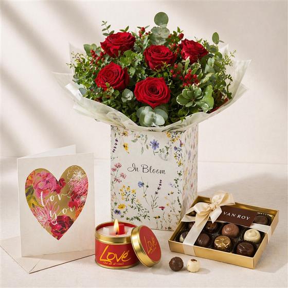 Six red roses paired with a love candle, indulgent chocolates, and a heartfelt card everything you need to say I love you in the most thoughtful way.