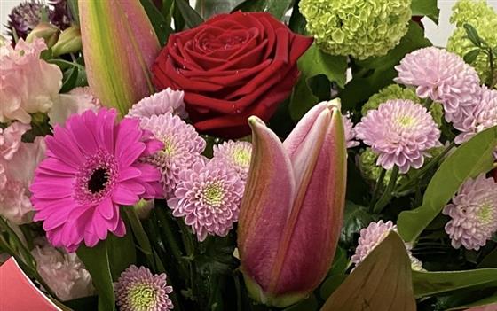 A romantic mix of seasonal flowers in soft pinks, richer reds and fresh green tones, designed to feel full, balanced and easy to enjoy.