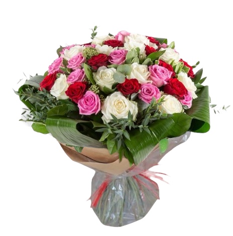 Absolutely breathtaking, this lavish display is mix of 36 premium roses; stunning red roses, the sweetest pink roses and heavenly white roses all expertly cultivated by specialty growers. This bewitching display is then dressed with touches mixed eucalyptus and seasonal foliage.
