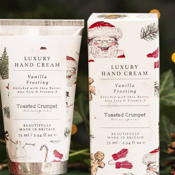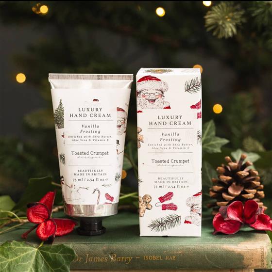 Immerse your hands in the luxurious care of our Vanilla Frosting Luxury Hand Cream from Toasted Crumpet. This 75ml tube is a part of our All Things Jolly Collection, designed to moisturize and soften your hands. Inspired by the beauty of the British countryside, this cream carries the comforting scent of vanilla frosting, offering a sensory experience that brings nature indoors. Enjoy the feeling of nature on your skin with our hand cream, proudly produced in Britain.