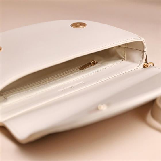 Made of vegan leather, this bag features woven strips laid out to create a unique texture on the front and back of the bag. Open the flap to reveal a lined interior in a matching beige shade. The inside has a zipped pocket for storing small accessories, and the bag itself is the perfect size for your go-to pieces.